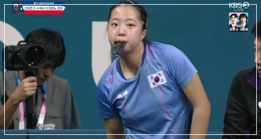 | 신유빈 선수의 올림픽 경기 중 섭취 장면 방송 |